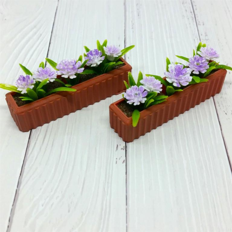Der Blumenkasten mit Riffeleffekt in Terrakotta mit 5 Blüten ist 5,0x1,2x2,0 cm, LBH und ist ein 3D Druck. Die obere Seite ist mit echter Erde bedeckt (fest). Der Blumenkasten ist 5,0x1,2x1,2 cm. Reine Handarbeit. (F21)