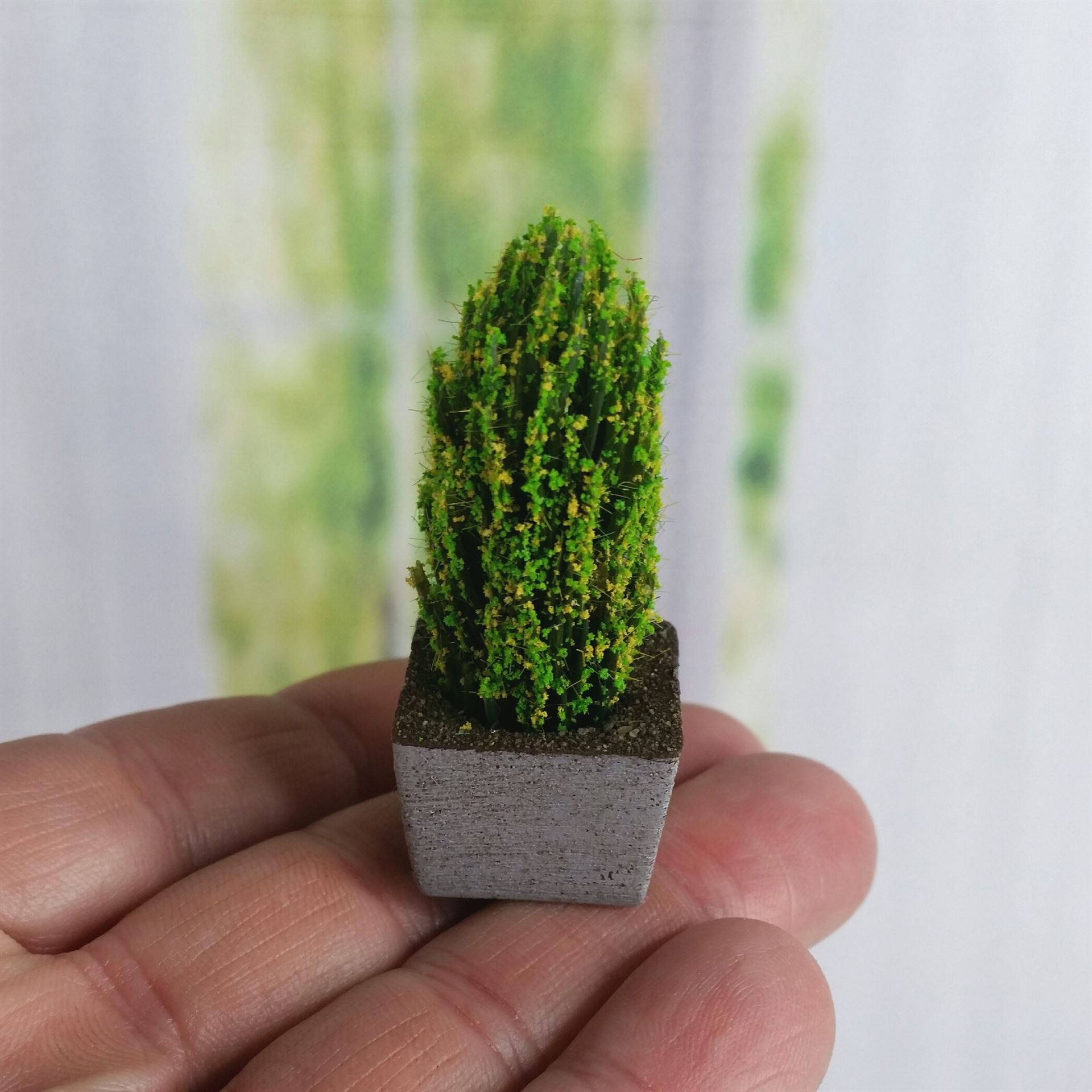 Die Pflanze hat eine Höhe von ca. 5,5 cm und eine Breite von ca. 1,5 cm und ist aus Kunststoff beflockt. Der Blumenkübel ist 2,3 x 2,3 x 1,7 cm und aus Gießwachs und mit Effektlack bearbeitet. Die obere Seite ist mit echter Erde bedeckt (fest). Reine Handarbeit. (F08)