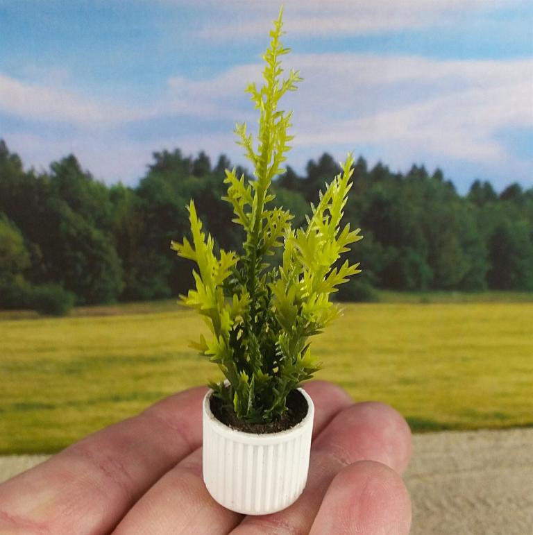 Puppenhaus Miniatur-Pflanze ( Lebensbaum ) im Kübel ist 8,5x2,5 cm. Handgefertigt aus Kunststoff, im Maßstab 1:12. Der Kübel ist 1,8x1,8 cm und aus Kst. (F03)