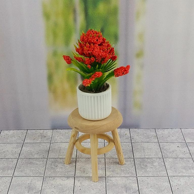 Die Pflanze hat eine Höhe von insg. ca. 5,0 cm und eine Breite von ca. 2,5 cm und ist aus Kunststoff und beflockt. Der Blumentopf ist 2,0x1,7 cm und aus Kst. Ohne Hocker.