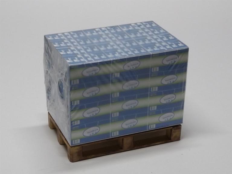 Der Paletten-Aufbau ( Milchkartons ) ist aus Druck-Karton ( eigenes Design ) und ist 84x54x62 mm, LBH und in Folie verpackt. Ohne Palette.