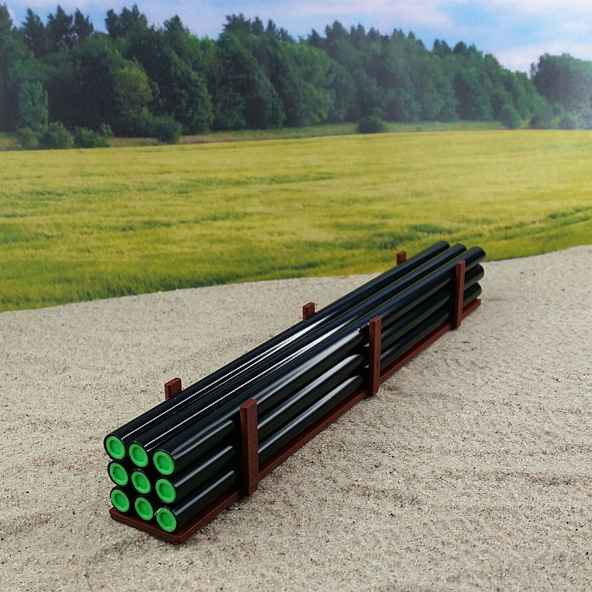 Die 9 Abwasser-Rohre mit Endstopfen im Transport-Rahmen können einzeln heraus genommen werden. Das Ladegut kompl. ist 190x26x25 mm. Die Rohre sind aus 7 mm Kst-Rohre hergestellt. Der Rahmen ist ein 3D Druck Rostrot lackiert.